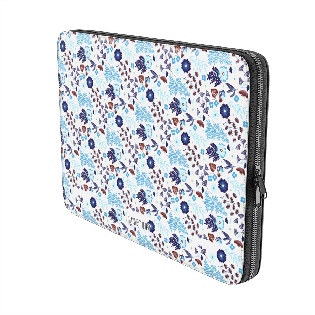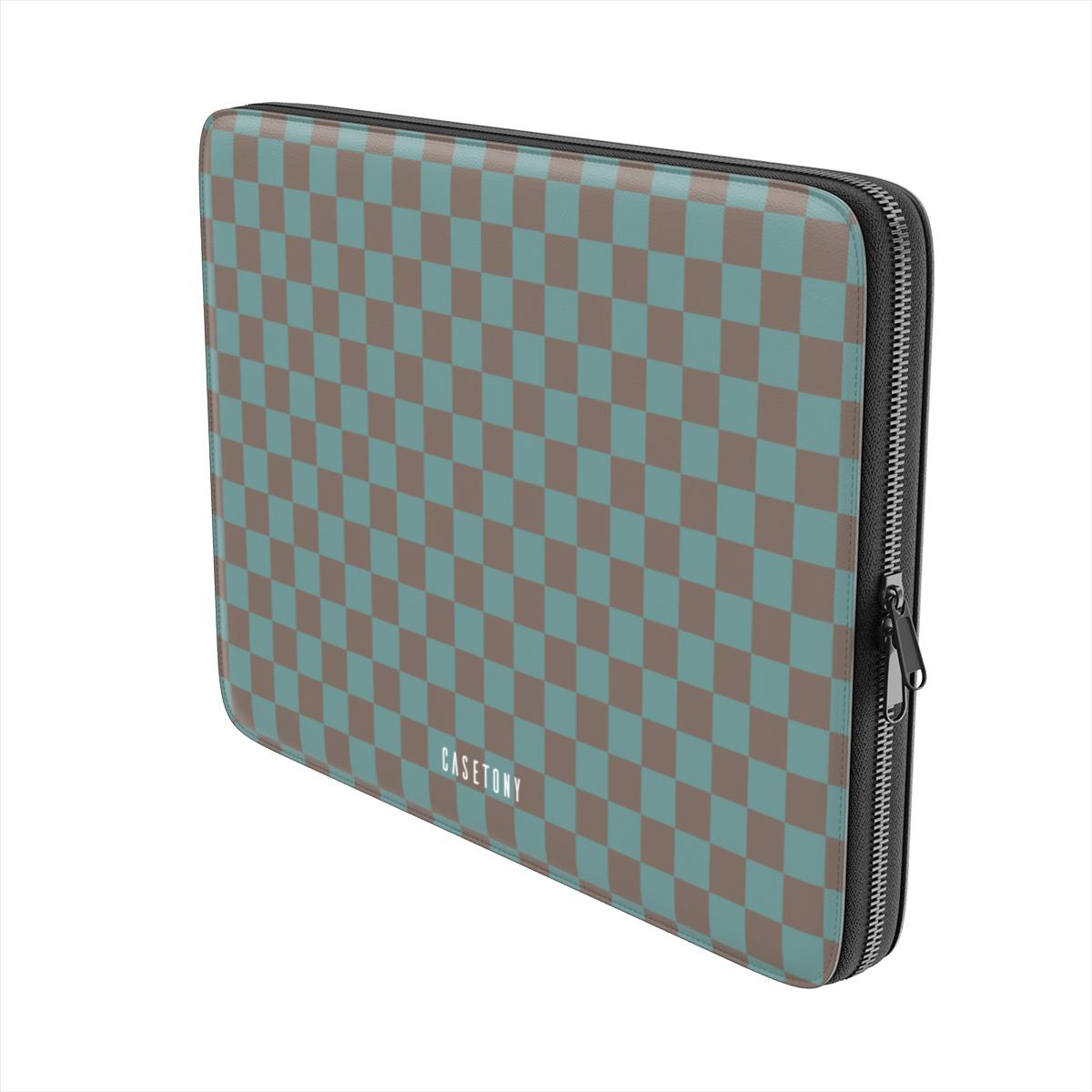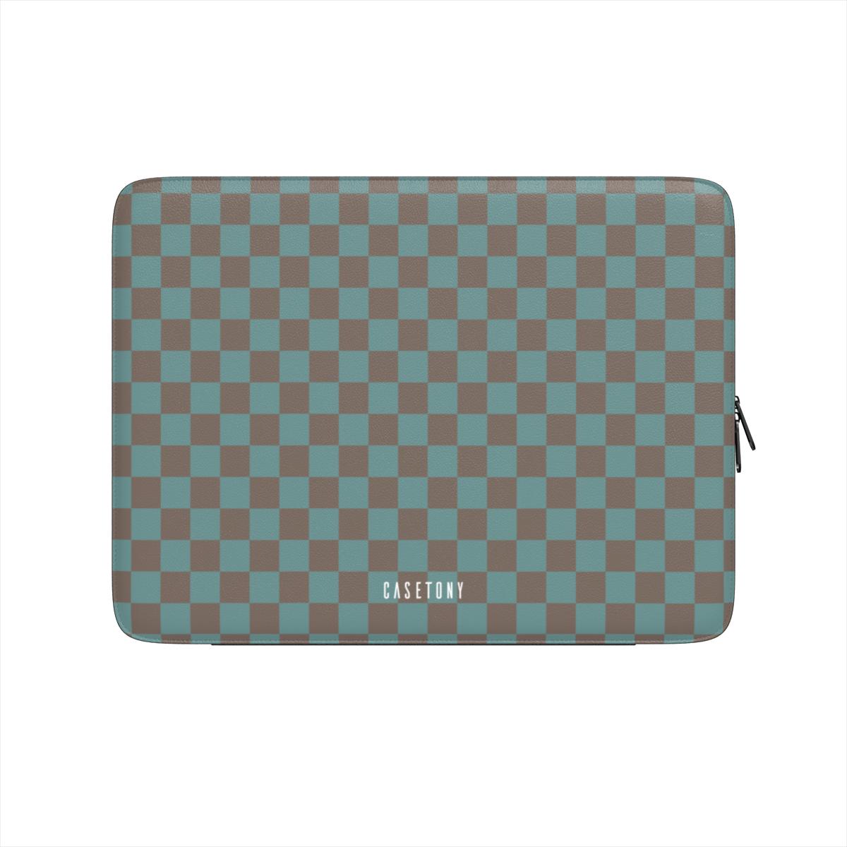 Person holding a phone case with checkered pattern and three other phone cases with different designs on a blue background.